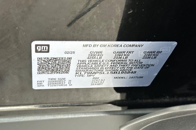CARFAX One-Owner. Clean CARFAX. Mosaic Black Metallic 2025 Chevrolet TrailBlazer LT FWD CVT 1.3L I3 Turbocharged DOHC 12V LEV3-SULEV30 137hp CARFAX ONE OWNER, NON-SMOKER, Backup Camera, Bluetooth®, Alloy Wheels, Aluminum Wheels, Light Package, Power Mirror Package, Power Package, Remote Start, TrailBlazer LT, 4D Sport Utility, 1.3L I3 Turbocharged DOHC 12V LEV3-SULEV30 137hp, CVT, FWD, Mosaic Black Metallic, Jet Black w/Cloth Seat Trim, 1 Type-A and 1 Type-C USB Ports, 4-Way Manual Front Passenger Seat Adjuster, 4-Wheel Disc Brakes, 5.45 Final Drive Axle Ratio, 6 Speakers, 6-Speaker Audio System Feature, 6-Way Manual Driver Seat Adjuster, ABS brakes, Air Conditioning, Alloy wheels, AM/FM radio: SiriusXM, Auto High-beam Headlights, Brake assist, Bumpers: body-color, Cloth Seat Trim, Compass, Delay-off headlights, Driver door bin, Driver vanity mirror, Dual front impact airbags, Dual front side impact airbags, Electronic Stability Control, Emergency communication system: OnStar and Chevrolet connected services capable, Exterior Parking Camera Rear, Flat-Folding Front Passenger Seatback, Front Bucket Seats, Front Center Armrest, Front License Plate Bracket, Front reading lights, Front wheel independent suspension, Fully automatic headlights, Heated door mirrors, Illuminated entry, Knee airbag, Low tire pressure warning, Occupant sensing airbag, Overhead airbag, Overhead console, Panic alarm, Passenger door bin, Passenger vanity mirror, Power door mirrors, Power steering, Power windows, Preferred Equipment Group 1LT, Radio data system, Radio: AM/FM Stereo Audio System, Rear side impact airbag, Rear window defroster, Rear window wiper, Reinforced Electric Heater/Defroster System, Remote keyless entry, Ride and Handling Suspension, Security system, SiriusXM Trial Subscription, Speed control, Split folding rear seat, Spoiler, Steering wheel mounted audio controls, Tachometer, Telescoping steering wheel, Tilt steering wheel, Traction control, Trip computer, Variably intermittent wipers, Wheels: 17 High Gloss Black Machined Aluminum, Wireless Apple CarPlay/Android Auto.